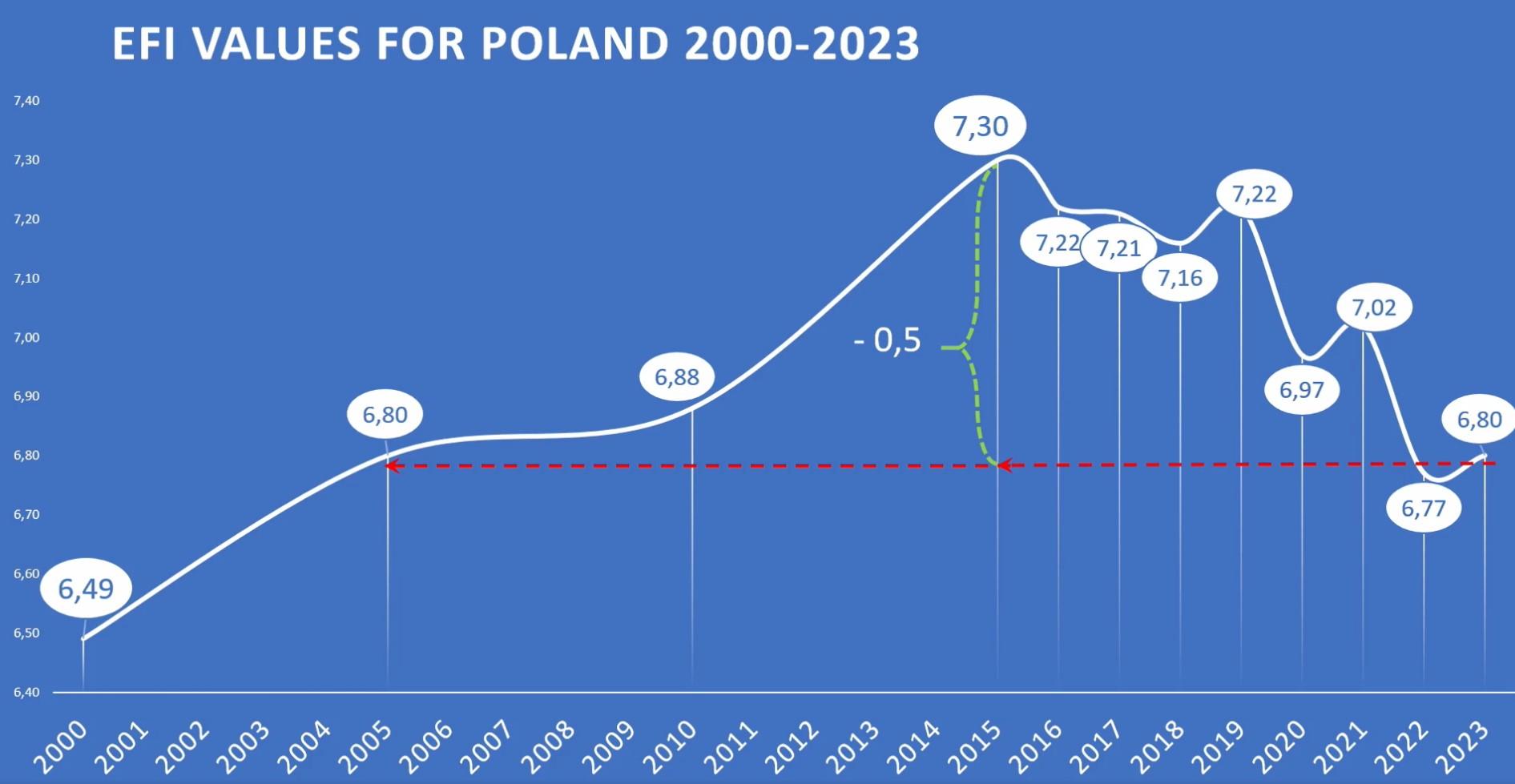 Fatalny wynik Polski oraz odległa pozycja w rankingu mogą skłaniać pesymistów do stwierdzenia, że gorzej być nie może, zaś optymistów do uznania, że owszem – może. Na szczęście warszawskim politykom nie wszystko udało się jeszcze zepsuć i nasz kraj ciągle jest w stanie zdobyć się na wolność gospodarczą. Jak wskazuje w artykule „Rosnąca prohibicja wolności gospodarczej, czyli spadek Polski o ćwierćwiecze” założyciel i prezydent Centrum im. Adama Smitha dr Andrzej Sadowski: „Polska ponownie potrzebuje tak daleko idących zmian, jak te, które miały miejsce na przełomie lat 80. i 90. poprzedniego wieku”, gdyż „nie było i nie ma lepszej metody na wyjście z tzw. pułapki średniego rozwoju oraz ze wszelkich spowolnień i kryzysów niż gwarancje wolności dla ludzkiej przedsiębiorczości”. Wymagałoby to jednak zrozumienia ze strony wyborców, że – wbrew opowieściom socjalistów – prawdziwymi „krwiopijcami” nie są najwięksi przedsiębiorcy, ale politycy, którzy uważają, że mają prawo bezkarnie zarządzać czasem, pieniędzmi i życiem obywateli, jak gdyby ci byli ich niewolnikami.