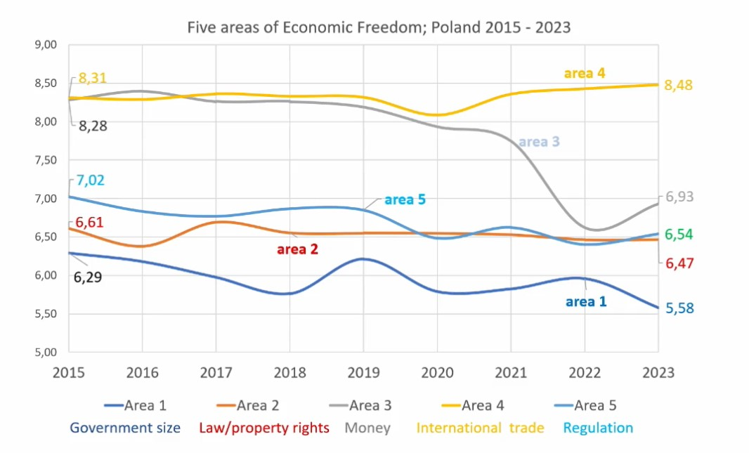 Tymczasem każdy socjalizm musi oznaczać ograniczanie wolności gospodarczej. Po pierwsze dlatego, że rząd zabiera się za rozdawanie i marnowanie pieniędzy, których jak powszechnie wiadomo, nie ma. Musi je zatem najpierw zabrać podatnikom, a co za tym idzie zmniejszyć swobodę gospodarowania ciężko zarobionymi środkami przez zwykłych ludzi. Po drugie pod płaszczykiem troski o obywateli rząd tworzy monopole, takie jak np. w oświacie albo służbie zdrowia, tym samym nie pozwalając na rozwinięcie się w tych branżach prywatnych przedsiębiorstw. Ekspert Centrum im. Adama Smitha prof. Kondratowicz zauważa, że „wolności gospodarczej w Polsce od dawna nie przybywa, odmiennie niż w wielu państwach naszego regionu”, co sprawia, że praktycznie wszystkie postkomunistyczne państwa Europy Środkowo-Wschodniej notują lepszy wynik od Polski.