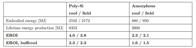 Jeszcze mniejsze wartości współczynnika EROI zostały uzyskane w przypadku magazynowania energii wytworzonej w panelach fotowoltaicznych za pośrednictwem akumulatorów litowych (buffered). Tutaj w skrajnym przypadku (zamontowane na poziomie gruntu panele fotowoltaiczne wykonane z krzemu amorficznego) wyliczona wartość współczynnika EROI wynosi zaledwie 1,5.