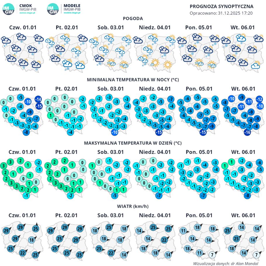 W Nowy Rok temperatura maksymalna ma wynosić od –2 stopni na wschodzie, około 0–1 stopnia w centrum, do 2–3 stopni na zachodzie i nad morzem. Nadal prognozowane są opady śniegu, a pokrywa śnieżna miejscami może zwiększyć się nawet o 10 cm. Silny wiatr, szczególnie na wybrzeżu i w górach, może powodować zawieje i zamiecie śnieżne.