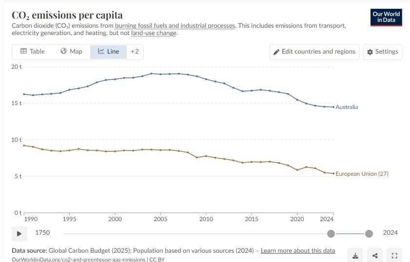 2. Czy Australijczykom nikt nie powiedział, że planeta płonie, skoro mają 2,7 razy wyższe CO2 na głowę od UE?