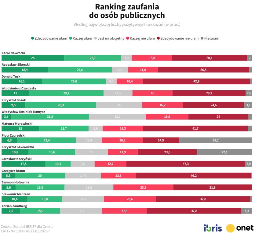 Prezydent Karol Nawrocki pomimo lekkiego spadku utrzymuje pozycję lidera sondażu zaufania przeprowadzonego dla Onetu przez IBRiS. Na podium znaleźli się też szef polskiej dyplomacji Radosław Sikorski oraz premier Donald Tusk. Największy wzrost zanotował Krzysztof Bosak z Konfederacji