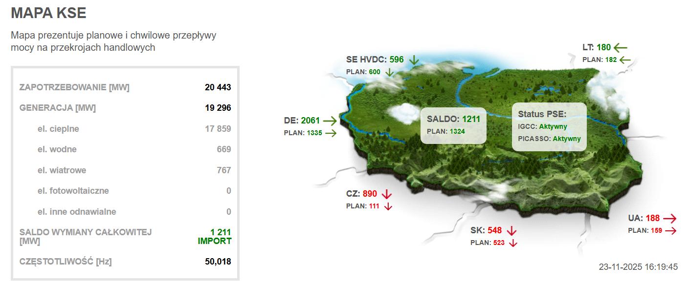 W tym kontekście warto przyjrzeć się nieco bliżej, skąd w okresie jesienno-zimowym czerpiemy potrzebną nam wszystkim do codziennego funkcjonowania energię elektryczną. Na rys. 2. przedstawiono zaczerpnięte z strony internetowej Polskich Sieci Elektroenergetycznych S.A. dane dotyczące zapotrzebowania mocy oraz aktualnego poziomu generacji mocy z różnego typu źródeł w dniu 23 listopada 2025 roku o godz. 16.19.