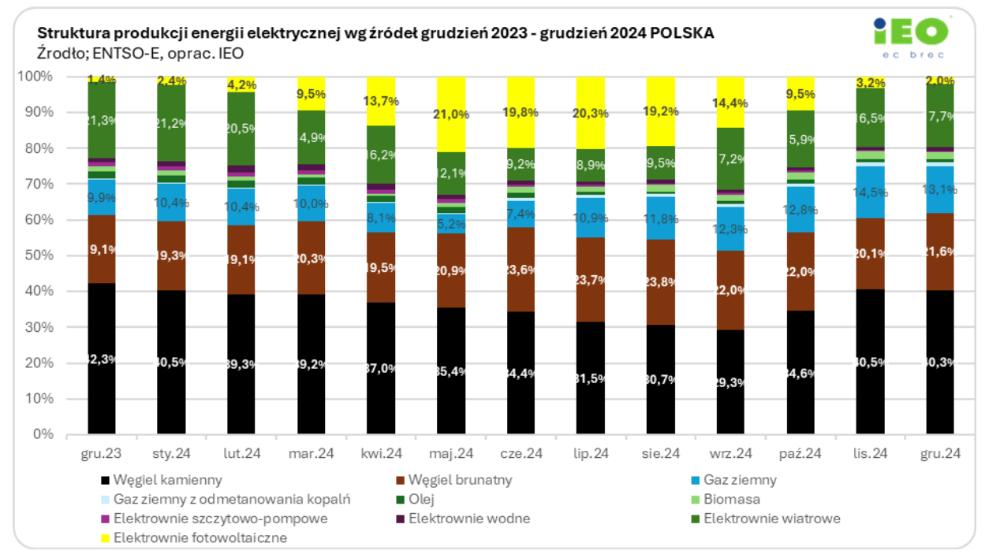Średni udział fotowoltaiki w krajowym miksie energetycznym wyniósł w roku 2024 zaledwie około 9 proc., co wyraźnie kontrastuje z ogromną wręcz wartością mocy zainstalowanej w tego rodzaju źródłach energii elektrycznej w naszym kraju, która sięga już 25 GW. Jest to tyle, ile wynosi łączna moc pięciu potężnych elektrowni węglowych tej wielkości, co Bełchatów. Jednak i tak relatywnie niewielka wspomniana tutaj wartość wynosząca zaledwie 9 proc. jest jedynie wartością średnią liczoną za cały rok, natomiast jak wygląda udział fotowoltaiki w krajowym miksie energetycznym w grudniu, można zobaczyć na rys. 3.