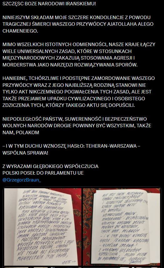 Uwagę ambasadora Rose przykuła wizyta polityka Konfederacji Korony Polskiej w ambasadzie Iranu. Braun udał się tam złożyć wpis w księdze kondolencyjnej po zabiciu w izraelsko-amerykańskich nalotach przywódcy Iranu ajatollaha Aliego Chamenei.