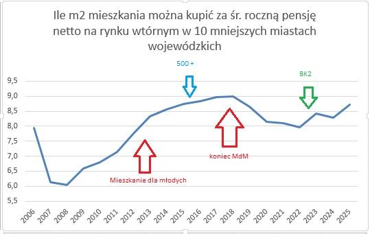 W 2025 r. za roczną śr. pensję netto można było kupić 8,7 m2 mieszkania w 10 mniejszych miastach wojewódzkich – tylko w latach 2017–2018 można było więcej (9m2). Obecny rok może być najlepszy do zakupu mieszkania w ostatnich 20 latach. Wystarczy, że politycy nie wymyślą jakiegoś idiotycznego programu wspierającego sprzedających.