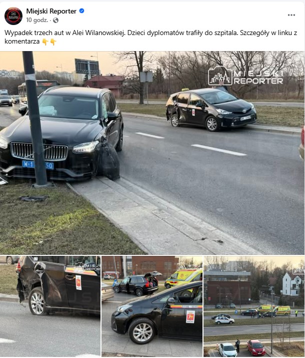 Z nieoficjalnych ustaleń wynika, że kierujący Volvo – samochód na blachach dyplomatycznych – z nieustalonych dotąd przyczyn uderzył najpierw w Toyotę, a ta uderzyła Volkswagena. Następnie Volvo wpadło w znak drogowy i latarnię.