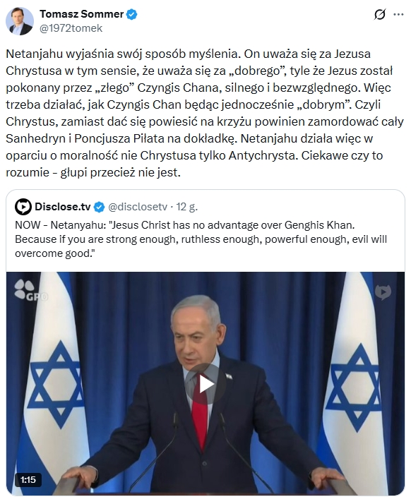 „Netanjahu wyjaśnia swój sposób myślenia. On uważa się za Jezusa Chrystusa w tym sensie, że uważa się za „dobrego”, tyle że Jezus został pokonany przez „złego” Czyngis Chana, silnego i bezwzględnego. Więc trzeba działać, jak Czyngis Chan będąc jednocześnie „dobrym”. Czyli Chrystus, zamiast dać się powiesić na krzyżu powinien zamordować cały Sanhedryn i Poncjusza Piłata na dokładkę. Netanjahu działa więc w oparciu o moralność nie Chrystusa tylko Antychrysta. Ciekawe czy to rozumie – głupi przecież nie jest” – skwitował Sommer.