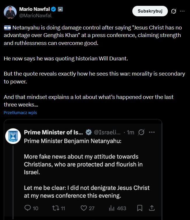 „Netanjahu próbuje ograniczyć szkody, mówiąc na konferencji prasowej, że „Jezus Chrystus nie ma żadnej przewagi nad Czyngis-chanem”, twierdząc, że siła i bezwzględność mogą zwyciężyć nad dobrem. Teraz twierdzi, że cytował historyka Willa Duranta. Ale cytat ten dokładnie pokazuje, jak postrzega tę wojnę: moralność jest drugorzędna w stosunku do siły. A to nastawienie wiele wyjaśnia w kontekście wydarzeń z ostatnich trzech tygodni” – stwierdził Nawfal.