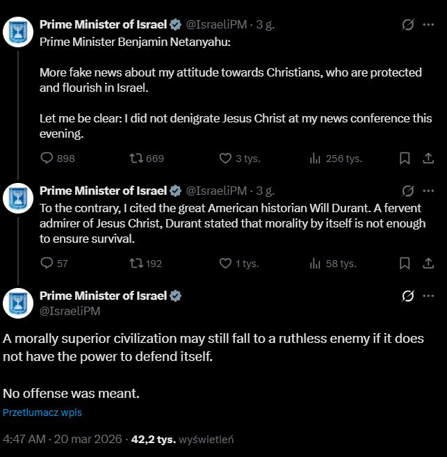 „Kolejne fake newsy na temat mojego stosunku do chrześcijan, którzy są chronieni i prosperują w Izraelu. Powiedzmy sobie jasno: nie znieważyłem Jezusa Chrystusa na mojej dzisiejszej konferencji prasowej. Wręcz przeciwnie, zacytowałem wybitnego amerykańskiego historyka Willa Duranta. Durant, żarliwy wielbiciel Jezusa Chrystusa, stwierdził, że sama moralność nie wystarczy, by zapewnić przetrwanie. Moralnie wyższa cywilizacja może nadal paść ofiarą bezwzględnego wroga, jeśli nie będzie miała siły, by się bronić. Nie miałem zamiaru nikogo obrazić” – przekonywano na oficjalnym profilu premiera Izraela na X.